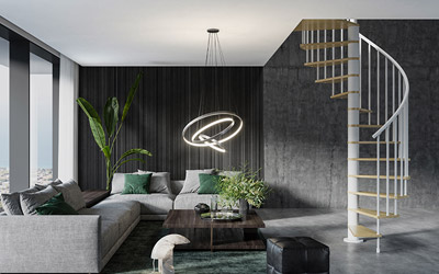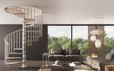 The modular spira staircase which combines the warmth of solid wood with the strenght of steel, offering a variety of combinations of diameters and finishes.